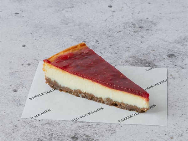 Onze cheesecake is te herkennen aan de heerlijk dubbelgebakken koekbodem verrijkt met roomboter, vulling van zachte roomkaas met citroen en daarop een laagje jam van aardbeien, frambozen, bramen en citroen.